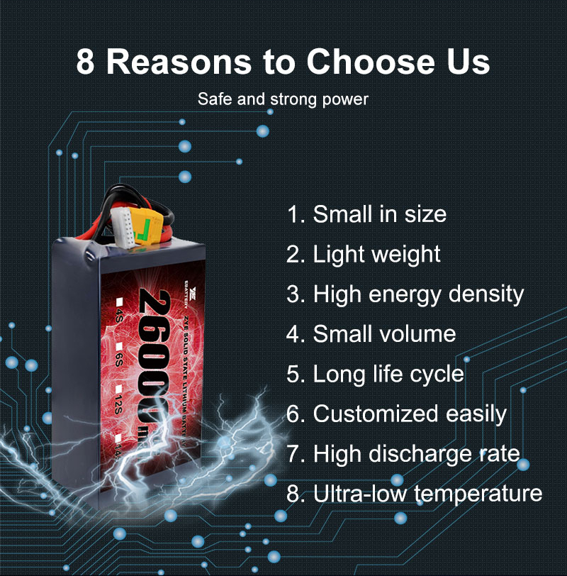 அதிநவீன தொழில்நுட்பம்: எங்கள் திட-நிலை பேட்டரிகள் பேட்டரி தொழில்நுட்பத்தின் சமீபத்திய முன்னேற்றங்களைக் குறிக்கின்றன, இதில் சிறந்த செயல்திறன் மற்றும் பாதுகாப்பை வழங்குகிறதுஉயர் ஆற்றல் அடர்த்தி 22AH 20AH 22000MAH 10C 20C நீண்ட தூர ட்ரோன்களுக்கான சாலிட் ஸ்டேட் லி-அயன் பேட்டரி பேக்.