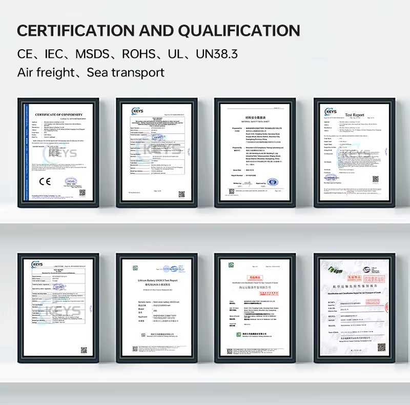 எங்கள்புதிய திட நிலை பேட்டரிகள்பாதுகாப்பு மற்றும் நம்பகத்தன்மையை உறுதி செய்யும் சர்வதேச தரத்தை பூர்த்தி செய்ய சான்றிதழ் பெற்றவை: